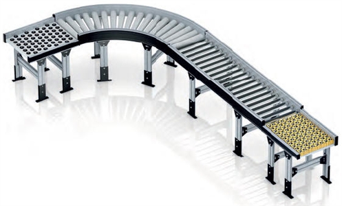 根據(jù)實際空間位置,滾筒輸送線設計了一個90°的彎道滾筒輸送線結(jié)構(gòu)。而對于彎道滾筒輸送線的動力驅(qū)動,決定應用將電機和減速器共同置于輥筒體內(nèi)部的新型驅(qū)動裝置——電動滾筒。為了形成滾筒彎道,設計時采用錐形電動滾筒。